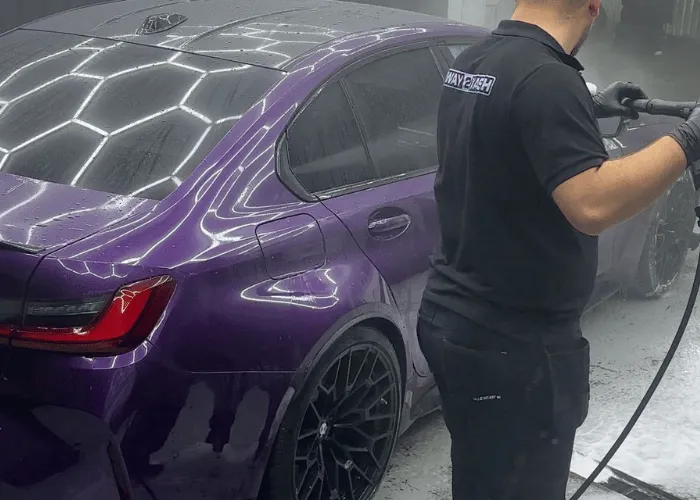 Efter att bilen noggrant sköljts från alla kem går vi vidare till nästa steg i processen. Därefter schamponerar vi hela exteriören för hand. Efter att bilen sköljts av avslutar vi med att torka av karossen, fälgarna och alla detaljer för att undvika kalkfläckar och säkerställa en felfri yta.